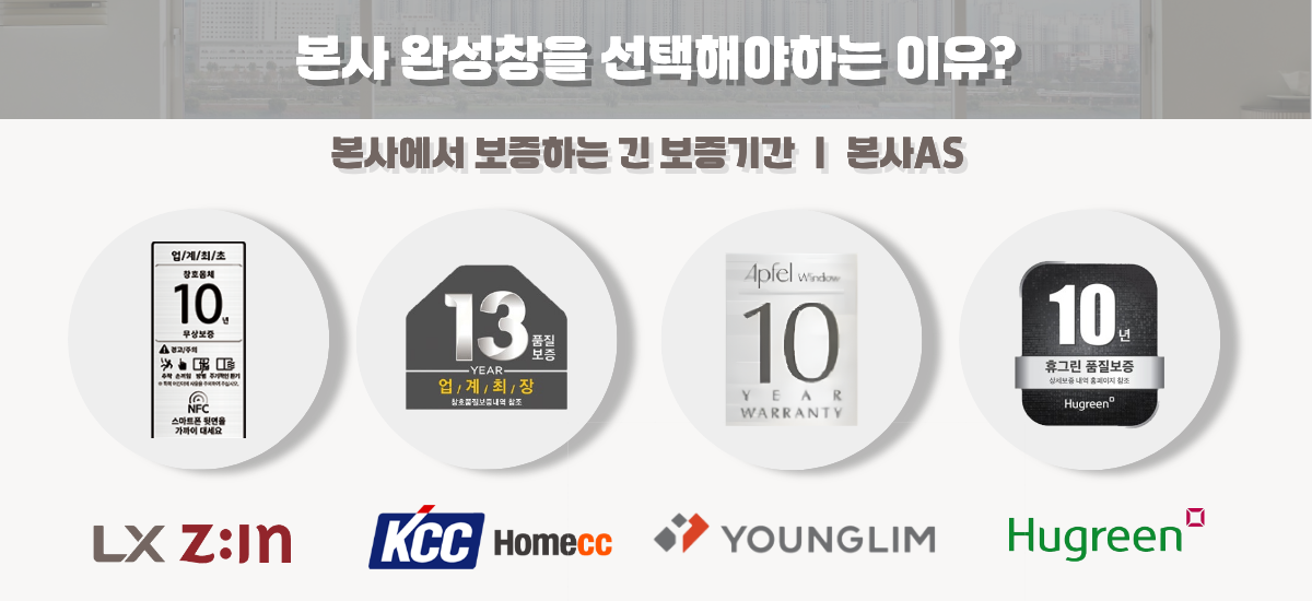본사 완성창 서비스 과정 4단계. 1단계: 본사 정품 창호 프레임 사용, 2단계: LX글라스, 한글라스, KCC글라스 등 정품 로고가 찍힌 본사 유리 적용, 3단계: 전문 시공팀의 꼼꼼한 직영 시공, 4단계: LX Z:IN, 홈씨씨 인테리어, 휴그린 등 각 본사가 보증하는 통합 AS 제공